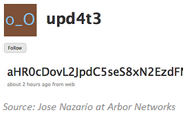Jose Nazario documented an early example of malware using Twitter for obtaining instructions. The attacker set up a Twitter account called “upd4t3”, on which he published Base-64 encoded text. The malicious program, running on the victim’s computer used the RSS feed to the Twitter account to retrieve the updates. The updates, once decoded, included Bitly-shortened URLs where additional malicious programs resided.