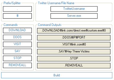 Another example of using Twitter to control malware comes in the form of TwitterNET Builder, which was designed to allow even a notice without programming skills to create a Twitter-controlled botnet. An initial version of this malicious tool was described by Christopher Boyd at GFI Labs, among others. This bot-creation kit allowed the user to specify the Twitter account name that would be used for C&C, and offered the ability to customize the commands that the attacker would enter as Twitter updates to control the bot network.
