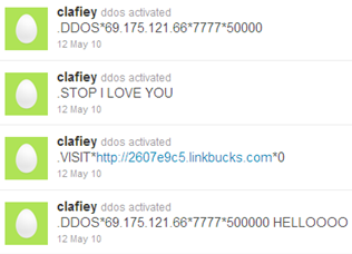 The command set supported instructions to download additional malware to the compromised system, launch a DDoS attack, visit desired URLs, etc. Here’s an example of one Twitter account being used to control the botnet created with this tool: