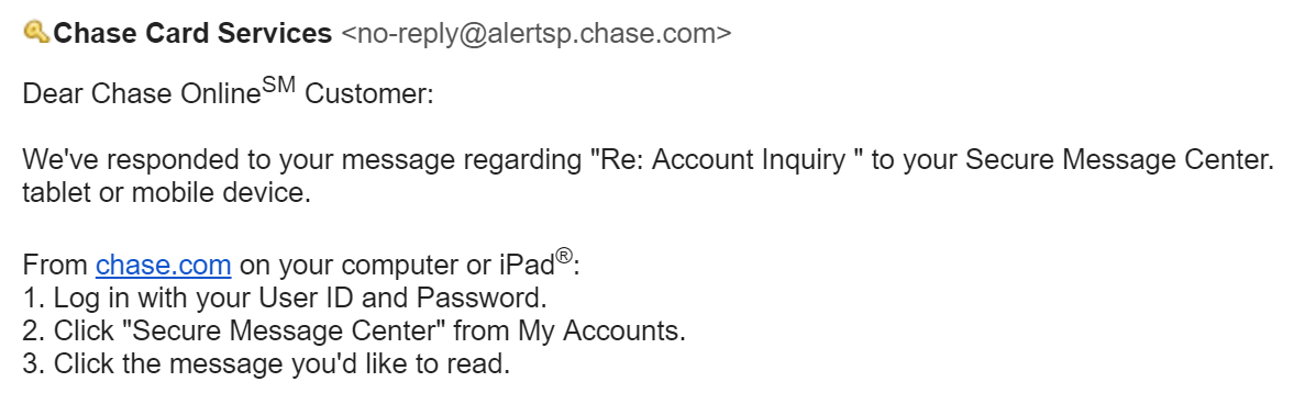 An example of a similarly-sparse and authenticated message came from Chase Card Services. This message was authenticated, avoided deep links, employed HTTPS and succinctly referred to a recent transaction.