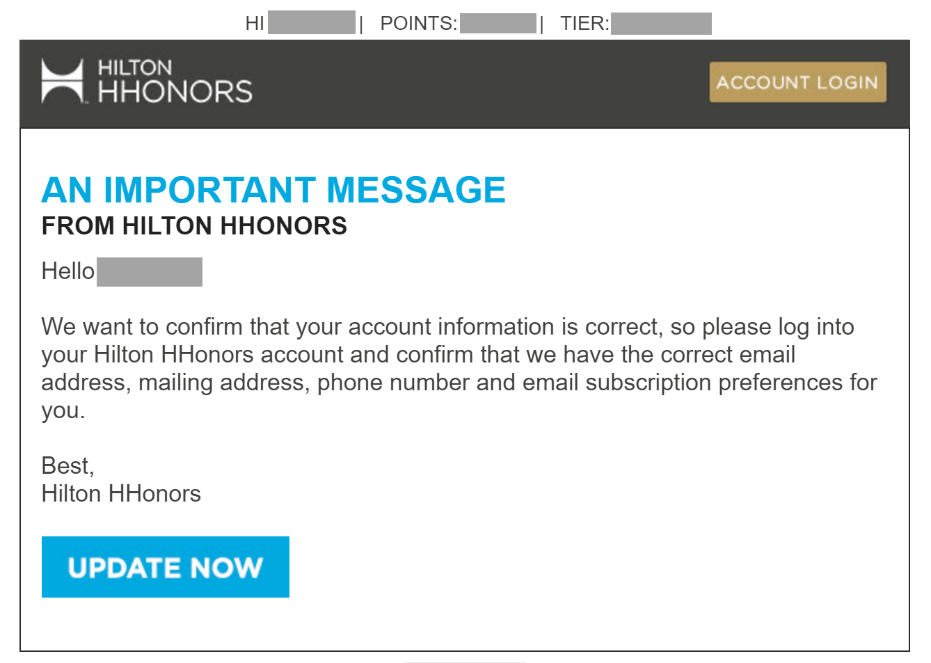 Perhaps to help establish the message’s legitimacy, it included some details specific to the intended recipient: The person’s first name, Hilton HHonors membership tier and the number of the loyalty points. However, first names aren’t private and can easily obtained by miscreants; the membership tier can be guessed with a high degree of success; and the recipient is unlikely to know his or her number of points to be able to validate the message’s authenticity at a glance.