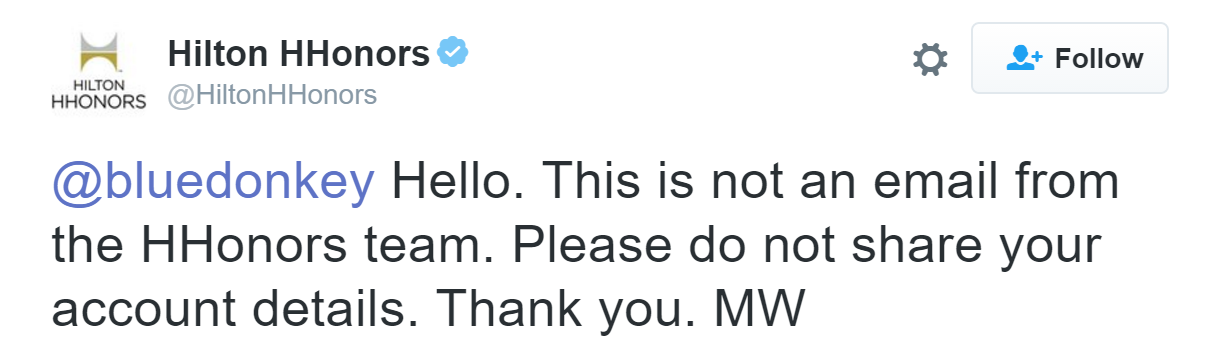 In fact, this email message looked so much like phishing, that even Hilton’s own support team on Twitter thought it was fraudulent: