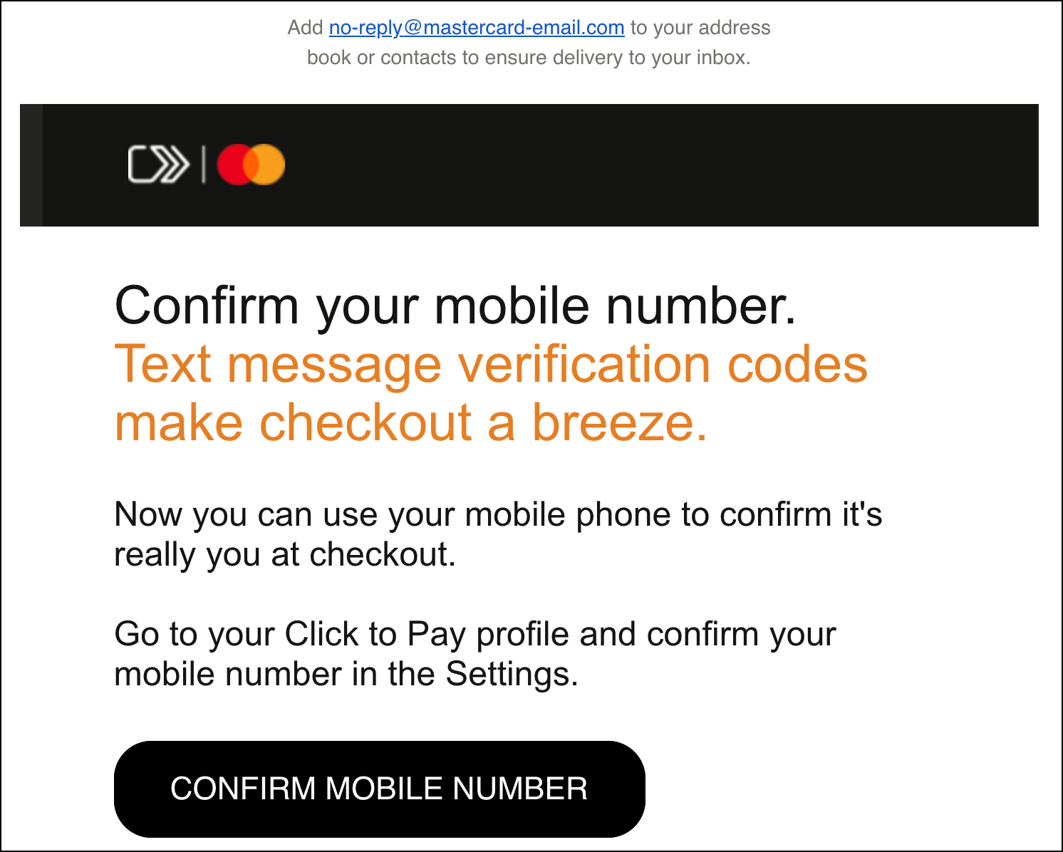 The message referenced sensitive information—mobile phone number—that security professionals warn people to avoid giving out. Moreover, the message was sent not from the well-known mastercard.com domain, but from mastercard-email.com, which looks just like the copycat domain that a malicious sender would set up.