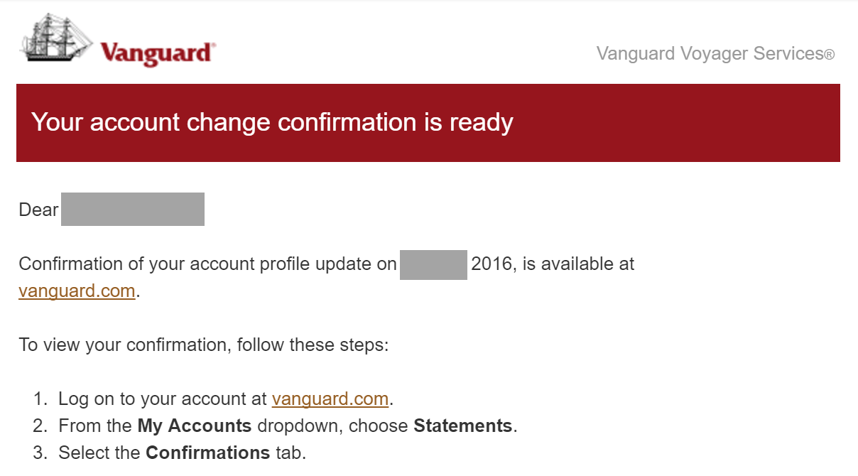 Unfortunately, the illustrations above tend to be the rule rather than the exception. I struggled to find an example of an email that, in my opinion, demonstrated a more secure approach. Fortunately, I came across the following message from Vanguard Voyager Services possessed many positive aspects: