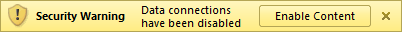Here’s another, similar security warning from Microsoft Excel 2010, stating that “Data connections have been disabled.”