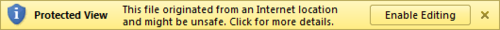Below is a Microsoft Office security warning that I actually like. It occurs when the user opens a document downloaded from the Internet, in which case Office uses a restricted viewer called Protected View, instead of a full-featured editor.