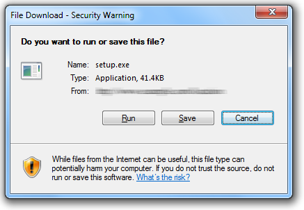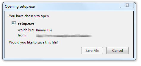 Though the message presents no text of caution, at least there is no option to run the program—only an opportunity to “Save File”. In this case, the browser leaves it up to the OS to warn the user when he or she attempts to run the program downloaded from the Internet.