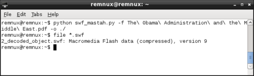 Here’s a quick example, which uses the malicious PDF file “The Obama Administration and the Middle East.pdf” that was documented on Contagio Malware Dump. SWF Mastah (a.k.a. swf_mastah.py) can scan the PDF file, automatically locate a Flash object and extract it, all in one step:
