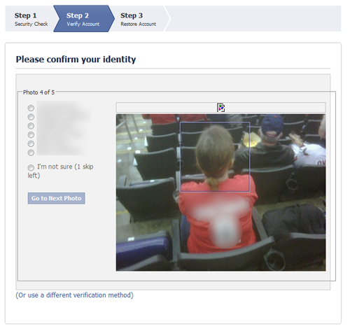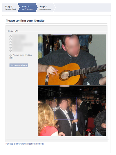 If the user selects the photo option, they are asked to successfully tag photos of 5 friends. Facebook presents one or two photos of a friend per page, and lists 5 multiple-choice options of that person’s name; each choice is a name of the user’s Facebook friend. The user needs to select the name of the pictured friend to proceed.