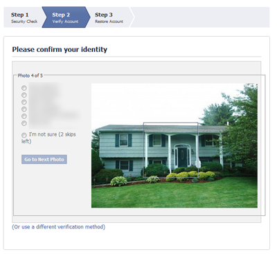 Facebook prompts the user to authenticate using the “social CAPTCHA” approach if the site notices an anomaly in the way the person is logging in. In one such case, Facebook states: “You are signing in from a location we’re not familiar with. For your protection, please take a moment to answer a few security questions.” The user is then presented with an option to answer their predefined secret question or to identify photos of their friends.