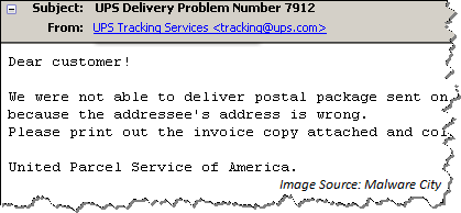 Consider the following mass-scale attack campaign that affected many organizations and individuals. It often feels like a targeted attack, but it isn’t. The recipient receives an email message that appears to come from UPS, and warns the person that the shipping company was unable to deliver the postal package. The message is crafted to social-engineer the victim into opening the email attachment, which may be malware in the form of a Windows executable or a PDF file.