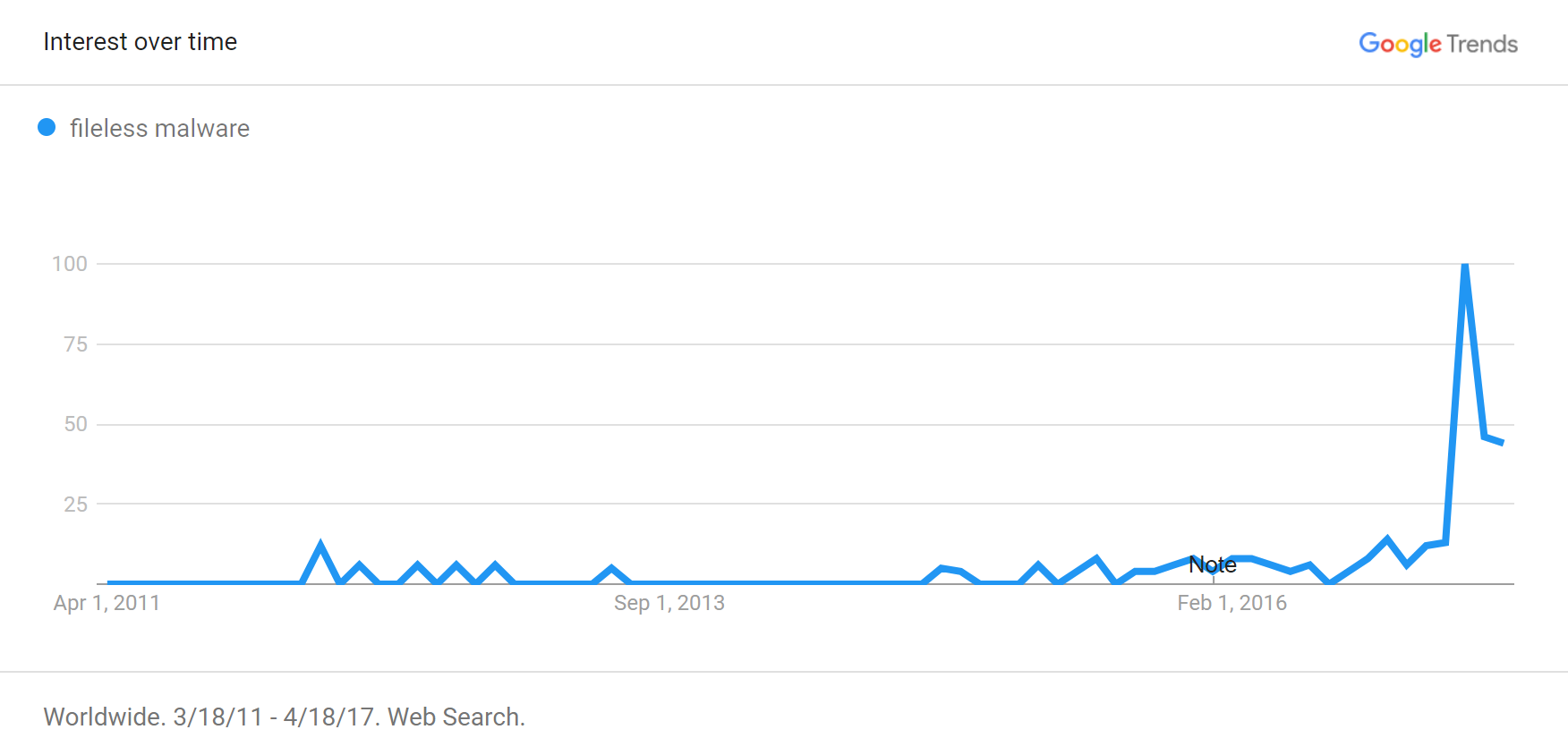 This pattern corresponds to the publicly-discussed malware that exhibited “fileless” capabilities in the recent years, and with the burst of research and marketing publications that appeared in 2017.