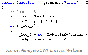 ActionScript included in malicious Flash ads can be obfuscated as well using a variety of techniques. One of these methods is implemented using a commercial (and non-malicious in itself) tool SWF Encrypt, rendering the code within a Flash program virtually unreadable.