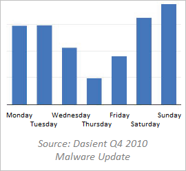 Unfortunately, it often takes a long time for the malicious ad to be disabled. Dasient’s Q4 2010 Malware Update reported the average lifetime of a malvertising campaign being about 10 days. Interestingly, according to Dasient’s data, Thursday appears to be the least popular day for malicious ads.