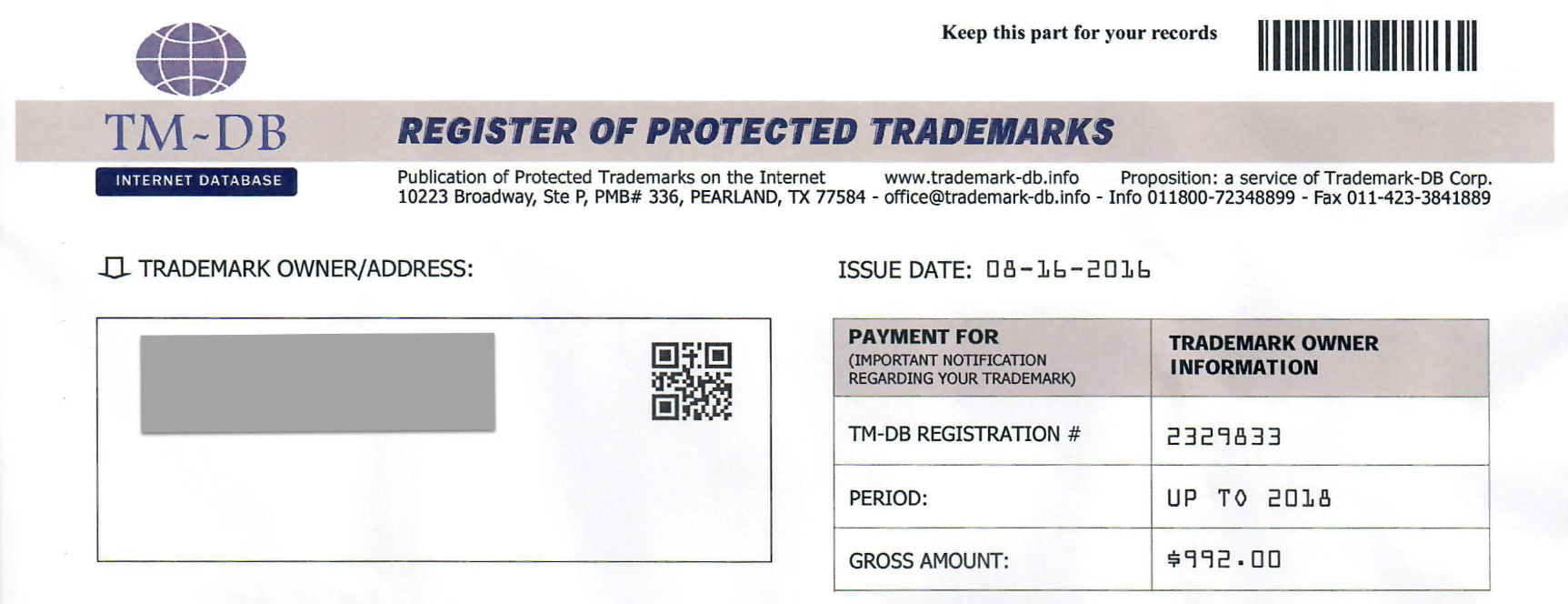The database maintained by Trademark-DB is online as well. Like the Trademark Info catalog, the contents of this database do not seem to be available in search engines’ indexes. A few queries that I ran showed me various records registered between 2005 and 2012. It’s strange that I didn’t come across the more recent entries, given that I came across “invoices” that Trademark-DB sent between 2013 and 2015. I doubt people stopped responding, so perhaps the company stopped bothering to add new entries to its database? Or maybe the dates in its database are wrong?