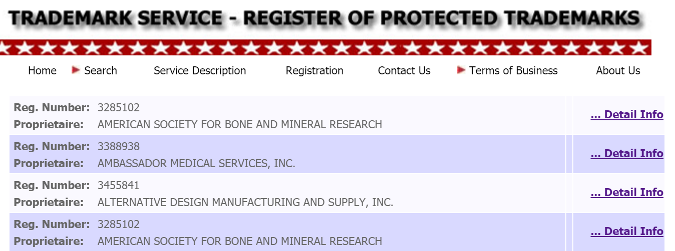 Presumably, each of these companies paid around $600 to be included in this listing, possibly because they misinterpreted the letter sent by Trademark Info as an invoice. The service for which they paid was of dubious value. As far as I can tell search engine don’t include the site’s contents in their index, so people are unlikely to come across the trademark’s entry in this database unless they specifically search the database for it.