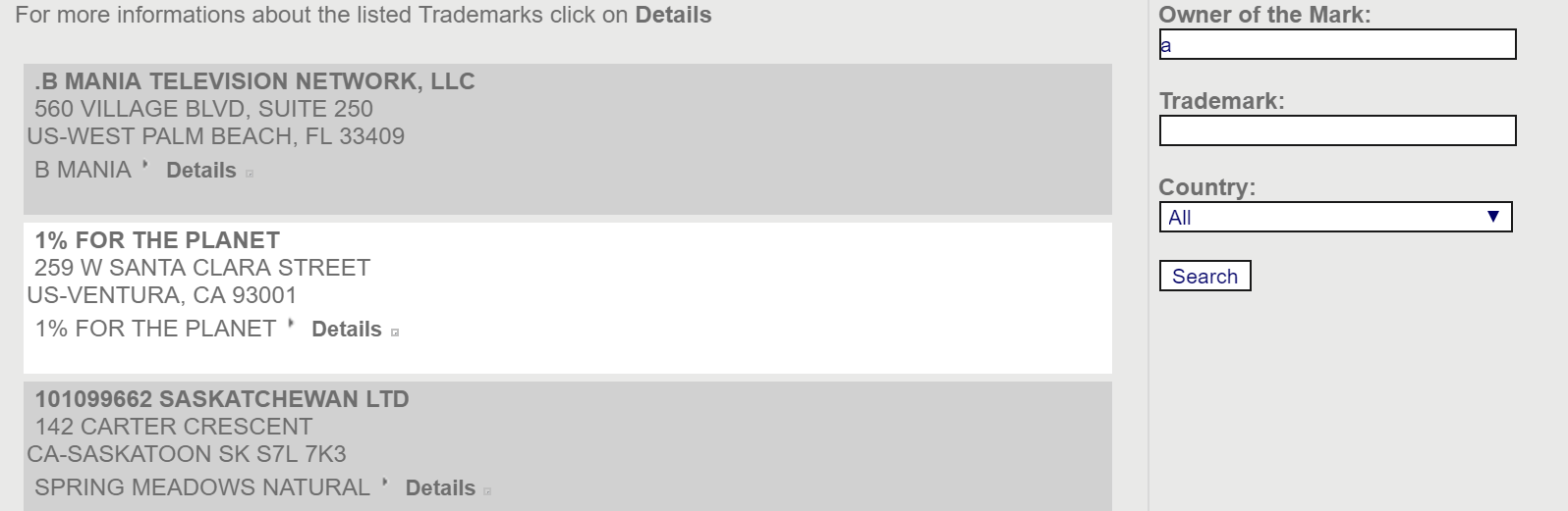 Though Trademark Info as a company appears to have been liquidated, the database hosted on its site is still available. I found no way to browse its full contents, but one can perform searches to query the records. For instance, when I search for records where the owner of the trademark contained an “a”, the site showed me 20 records of companies with addresses in the US and Canada.