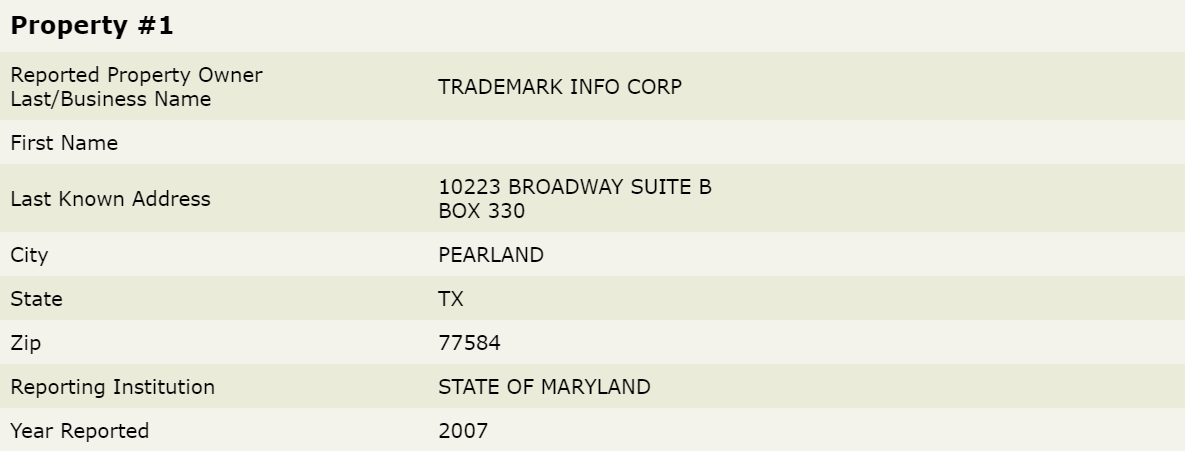 Another indication that companies issued payments to Trademark Info comes in the form of unclaimed funds that Texas Comptroller of Public Accounts is holding for the now-defunct company. I came across these records on the Texas government’s website that lets you search for such funds. It listed two unclaimed payments for $587 and two for $1,174, dating from 2005 to 2010.