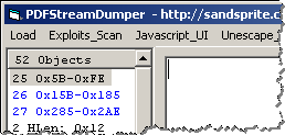 After installing PDF Stream Dumper, load the suspicious PDF file into it and start looking around. The tool includes a number of signatures of known PDF exploits. To scan the file, select “Exploits_Scan” from the menu:
