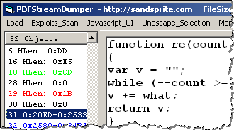 Targeting a vulnerability in Acrobat Reader is one of the more popular ways of compromising systems nowadays. PDF Stream Dumper is a free tool for analyzing suspicious PDF files, and is an excellent complement to the tools and approaches I outlined in the Analyzing Malicious Documents cheat sheet.