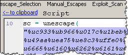 In the example we’re examining now, the script isn’t obfuscated. It seems to contain Unicode-encoded text, which is probably shellcode: