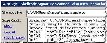 The tool recognizes the signatures of WriteFile and WinExec. This shellcode probably uses these calls to save and execute a malicious windows executable, which it might download from the Internet or which might be embedded into the PDF file itself.