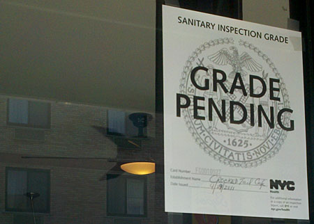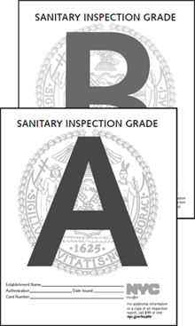 When assessing compliance with NYC’s food safety regulations, the inspectors assign points for the observed violations, as outlined in the scoring guide. The restaurant receives a letter grade based on the number of points. Passing the inspection requires grades A, B or C. Restaurants that earned a non-A grade can contest the sited violations; during this period, the restaurant can either post the initial grade or the “Grade Pending” sign.