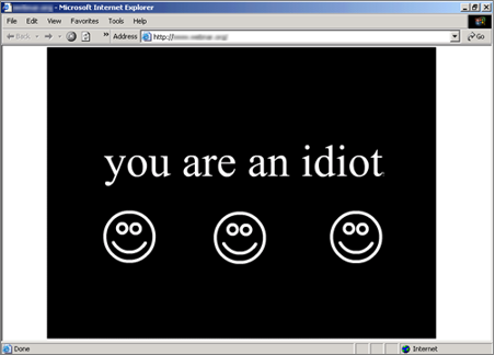 A while later I came across a network worm that played this sound file on victims’ computers, though I cannot find that sample anymore. While writing this post, I was surprised to discover a version of this page, sans the multi-window JavaScript trap, residing on www.youareanidiot.org. Maybe it’s true what they say: good joke never gets old.