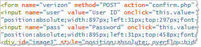 All elements of this page were unclickable images with the exception of the form that prompted the victim for his or her Verizon account credentials. The “Sign In” button would submit the data to the phisher’s server-side confirm.php script. Here’s an excerpt from the page’s HTML code: