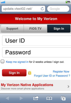The malicious domain vtext02.net appears to have been shut down by its registrar several hours after the phishing text message was received. When it was still active, the victim visiting the link on the SMS message would have seen the following page that mimicked the Verizon Wireless website: