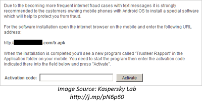 In the case of ZeuS malware variants that target mobile devices, persuasion originates from the victim’s PC. When the person visits a banking site from an infected computer, he is prompted to “download an authentication or security component onto their mobile device in order to complete the login process” according to Trusteer. In one case, as reported by Kaspersky Lab, the message attempted to trick the victim into installing a fake version of the Trusteer Rapport app for Android.