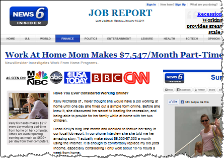 Rather than advertising the “Home Income Kit” directly, the website looks like a typical news story, reported by “News 6 Insider.” It also mentions trusted news-reporting brands, such as ABC, BBC and CNN. Surely, if this offer was discussed on those networks, it must be legit, right? Another instance of this site, reported as a scam in April 2010, includes a video shot as a news report. This is another attempt to add legitimacy to the advertised offer.