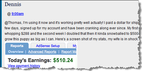 One of the comments even includes a photo of a check, eliciting the following (fake) response: “Holy cow Dennis! Thanks for posting that screen shot, you just gave me the inspiration I needed. Wow! :-)“