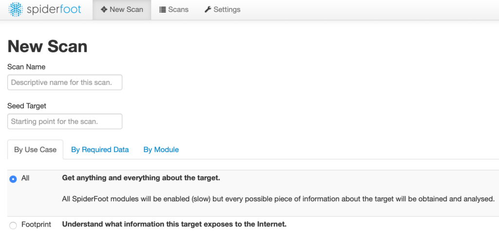 Once you’ve added the API keys, you can start your first scan by going to the New Scan tab as shown below. In the Seed Target box, you can specify domain names, email addresses, subnets, IPs, or another data type that you’d like to use as the starting point for your investigation.