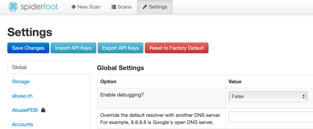Once you’ve accessed the SpiderFoot web app using your browser, go to the Settings tab to add API keys to at least some of the services that have a lock icon next to their name. SpiderFoot can query some data sources without keys; others, such as Google, BuiltWith, Censys, Have I Been Pwned, etc. require that you specify an API key.