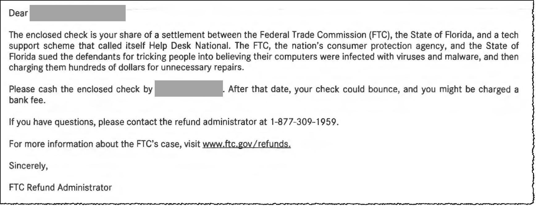 As the result of the actions by the FTC and the State of Florida, the individuals affected by the scheme received the following (legitimate) letter and the accompanying check from the refund administrator. It stated, “The enclosed check is your share of a settlement between the Federal Trade Commission (FTC), the State of Florida, and a tech support scheme that called itself Help Desk National. The FTC, the nation’s consumer protection agency, and the State of Florida sued the defendants for tricking people into believing their computers were infected with viruses and malware, and then charging them hundreds of dollars for unnecessary repairs.”