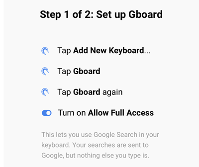 The user needs to grant Gboard full access so that Google can receive the person’s search terms. However, Google states that nothing else the person types is sent to Google. This is explained to the user from within the app during the setup process. Also, the statement is reiterated in the app’s privacy policy, which is refreshingly easy to understand. It states: