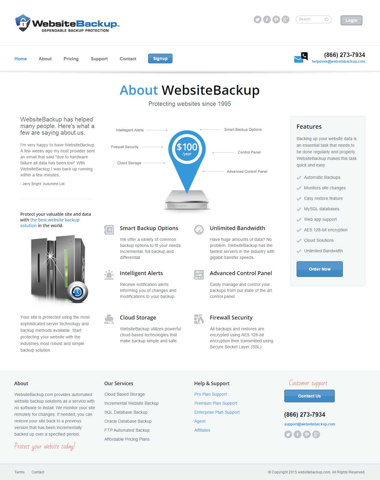 According to the data provided by DomainTools, websitebackup.com got registered to WebsiteBackup Company around December 2014, a few months before the confusing letters were sent out. Prior to that change, the website lacked content and was associated with another entity. Therefore, it’s unlikely that Greg J. has been using this service for 3 years, as he claimed in the review mentioned above. For this reason, I am doubtful of the claim, presented on the company’s website, that they’ve been “protecting websites since 1995.”