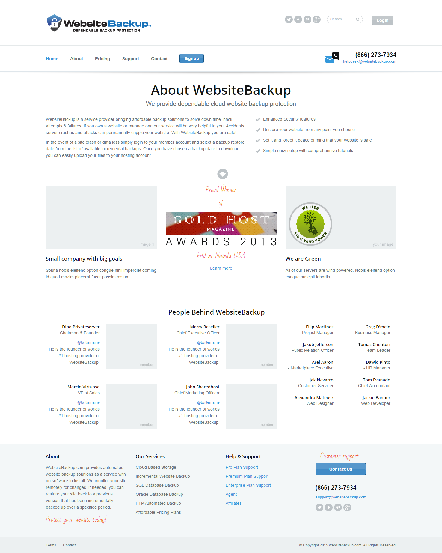 As a side note, the about.php page on the company’s website, the image of which I’ve captured for your viewing pleasure, offers a peak at the template that WebsiteBackup used for its website. The template included a place holder for listing the company’s management and development team, though it seems WebsiteBackup decided against using this version of the page. The source code of that page includes the phrase “All of our servers are wind powered,” which can be used to locate other websites using this template, if you feel so inclined.