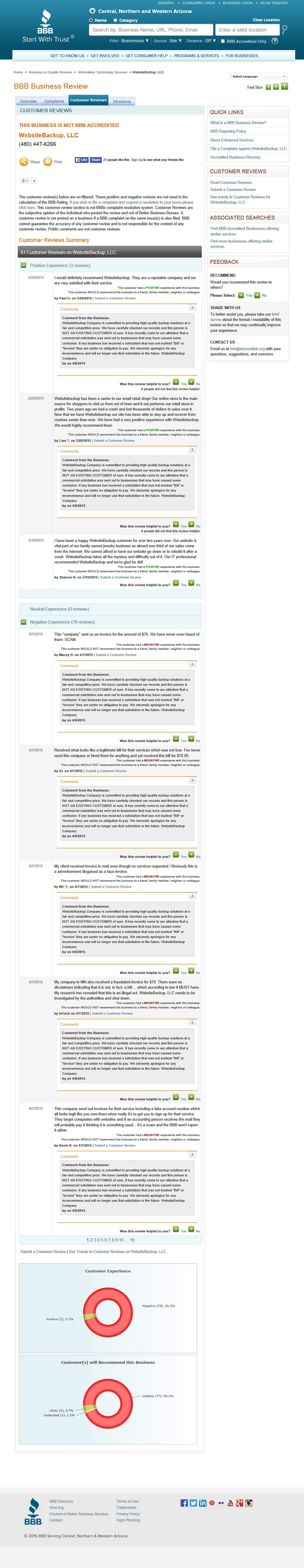 The Better Business Bureau website has a record of WebsiteBackup LLC, which states that the company is not BBB-accredited. However, it does list customer reviews. As of this writing, the site lists 3 positive and 78 negative experiences.