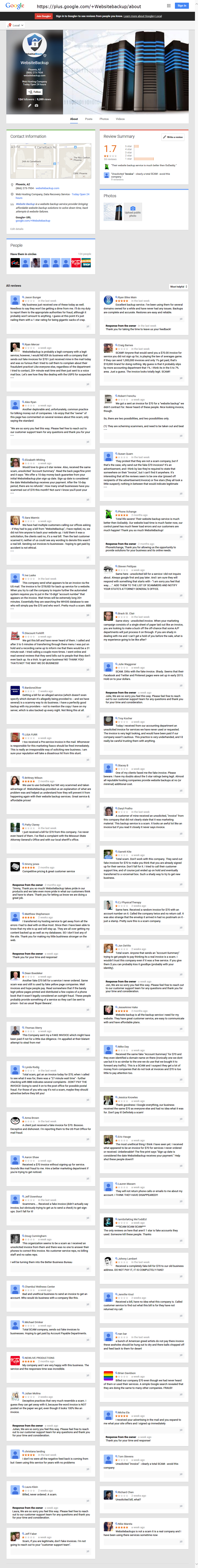 The Google+ page of WebsiteBackup shows 55 reviews as of this writing, with the company receiving 1.7 out of 5 stars. About 45 of the reviewers gave the company 1 star and expressed frustration and perspectives consistent with those published on Yelp. For instance, Jason Bunger wrote, “I’ll do my duty to report them to the appropriate authorities for fraud, although it probably won’t amount to anything. I guess at this point it’s just nailing them with a 1 star rating for being gigantic sacks of crap.”
