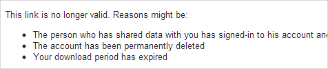 A day after reactivating the inactive account, my test user received a notice stating that the timeout period was reset and that trusted contacts no longer had access to the data. Indeed, at that point clicking in the “Download data” link took me to an “Invalid link” page: