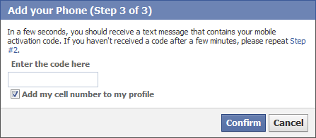First, the Facebook user needs to associate his mobile phone number with Facebook. This is a one-time step, which involves going to the “Update your Security Information” screen and clicking “Sign up for Facebook mobile.”Facebook will ask you to send an SMS text message consisting solely of the letter “f” to 32665 (FBOOK) from your mobile phone. Facebook will respond with a code, which you’ll need to enter into the “Add your Phone” wizard.